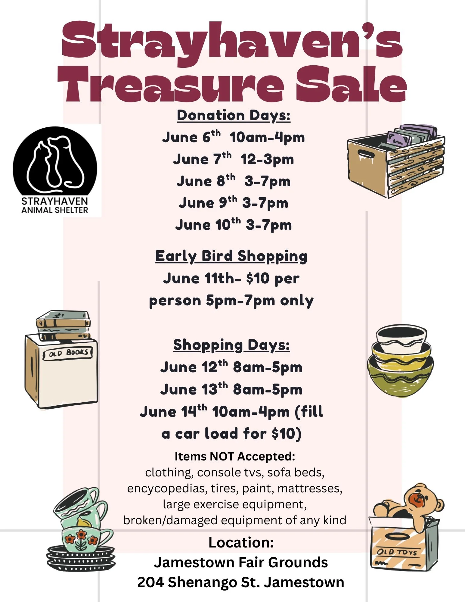 Back to All Events Strayhaven Treasure Sale Thursday, June 11, 2026 5:00 PM Sunday, June 14, 2026 4:00 PM Jamestown Fairgrounds 204 Shenango Street Jamestown, PA, 16134 United States (map) Google Calendar ICS